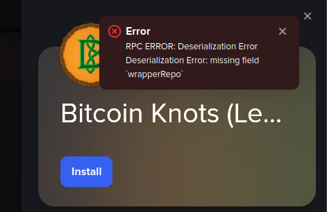 2026-03-19T08:04:09+08:00 2026-03-19T00:04:09.775592Z ERROR startos::install: src/install/mod.rs:277: Error sideloading package: Deserialization Error: missing field `wrapperRepo` at line 1 column 7866