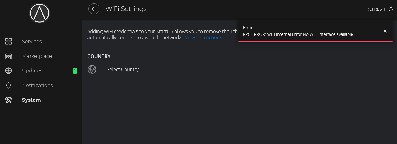 For best reliability, an always on server should be connected to your router or switch via Ethernet cable. StartOS servers are meant to be headless, which means without mouse monitor and keyboard. The server can be in another room, sitting right next to your router for easy wired connection. If for whatever reason this doesn’t work for you, you may be able to connect your server via WiFi, if StartOS can detect and has proper drivers for your wireless network adapter. You can find WiFi settings under the System menu. If you see a message, like in the attached pic, it means StartOS cannot detect your wireless adapter, and you’ll likely have to find a way to keep it physically connected, such as getting a switch with more ports on it. This would be a better option than using WiFi anyway.